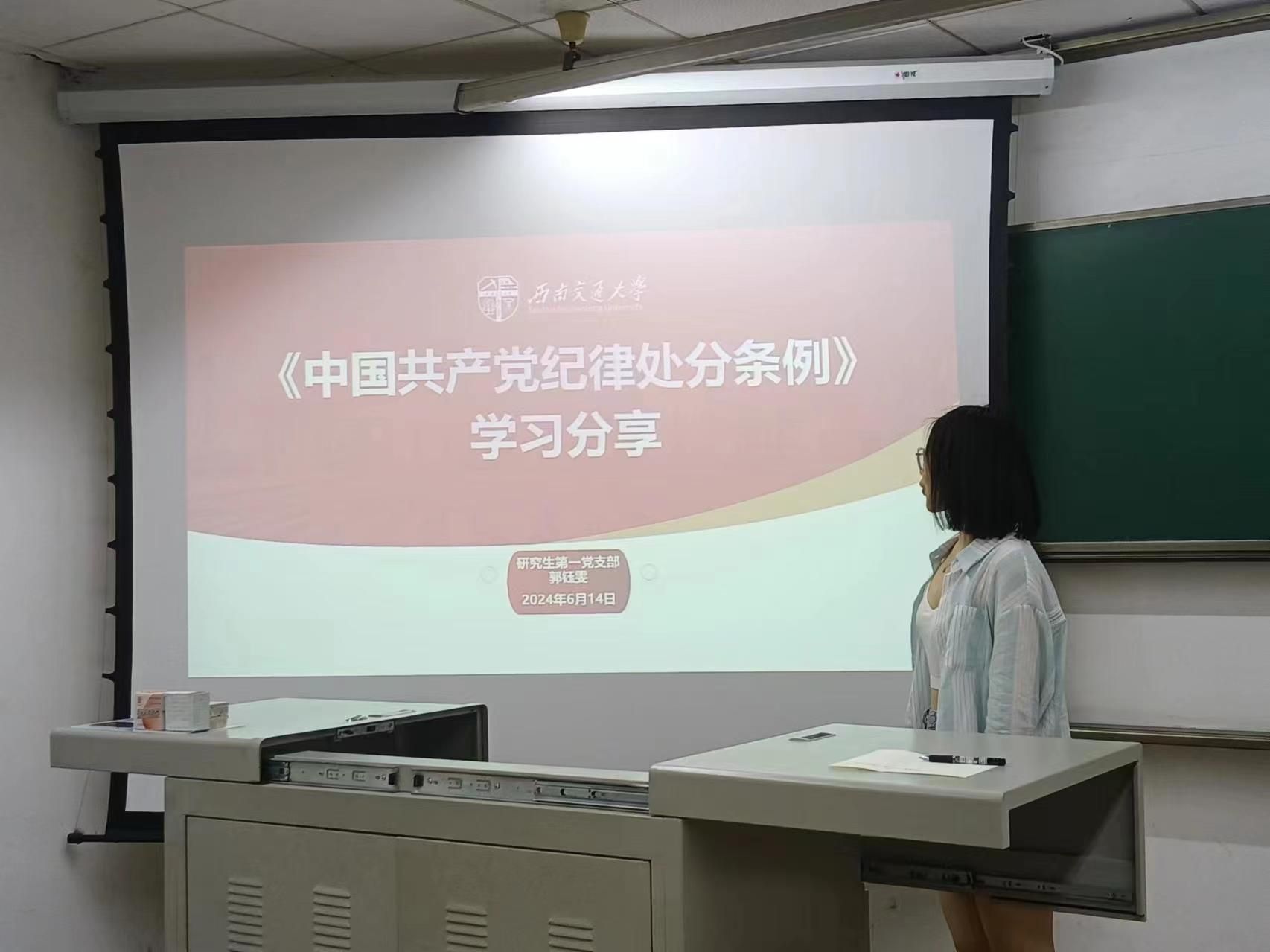 本次活动由党支部书记唐茂翔为主要领学人,以《中国共产党纪律处分条例》为主要学习内容,结合自身实际和岗位工作,开展了多层次、多形式的学习交流研讨,旨在引领广大研究生党员深刻理解党规党纪,增强党性修养和思想认同。