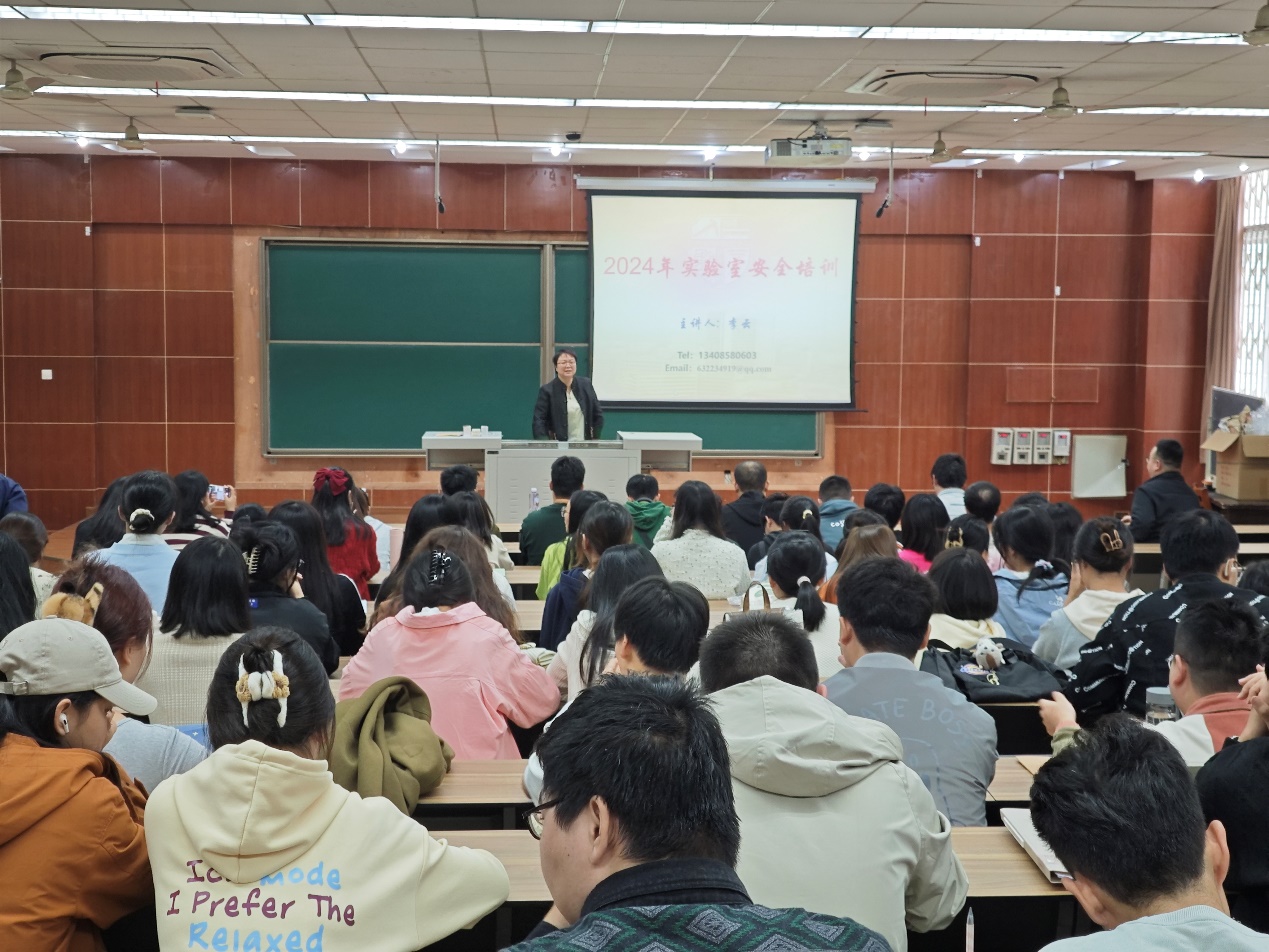 随后,学院实验中心的李云老师为新生们带来了实验室安全专题培训。李老师结合学院实验室的实际情况,从实验室安全管理、生物安全、化学安全、特种设备安全、加热及制冷装置安全、危险废弃物安全、水电安全、消防安全、防护与急救等方面进行了详细的讲解。他提醒新生们,实验室是一个复杂且存在潜在危险的环境,因此必须严格遵守实验室规章制度,规范操作,确保实验过程中的安全