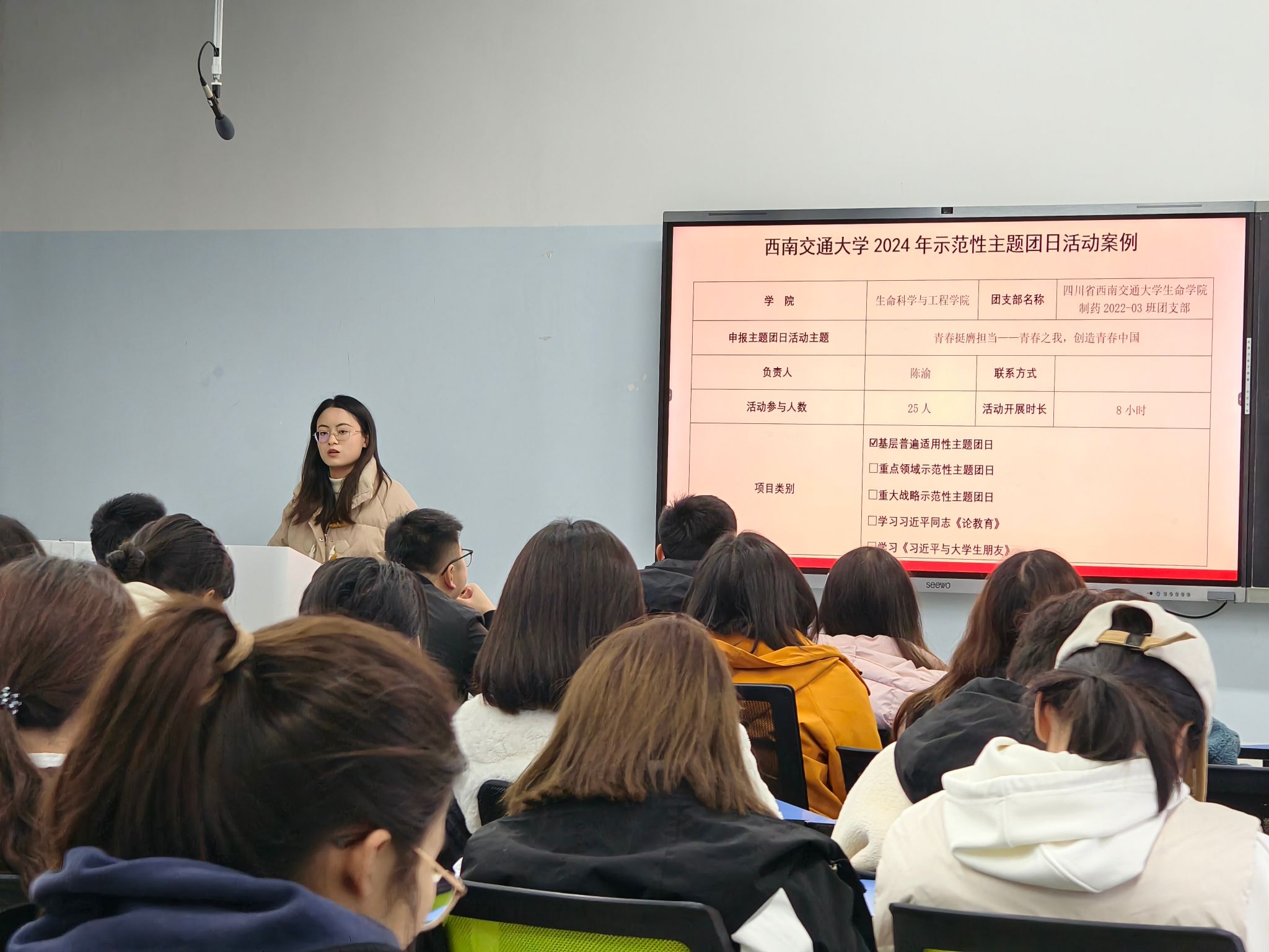 本次会议邀请了制药2022-03班班长陈秋伶分享班级管理与团支部建设经验。她从班级管理的日常事务入手,延伸至活动策划的创意构思,再聚焦到班团协同的紧密配合,通过一个个生动的实例,详细阐述了班级事务与团支部工作协同推进的具体举措,为在场的团干部们提供了极具价值的参考。最后,学院团委副书记潘星宇老师进行活动总结。