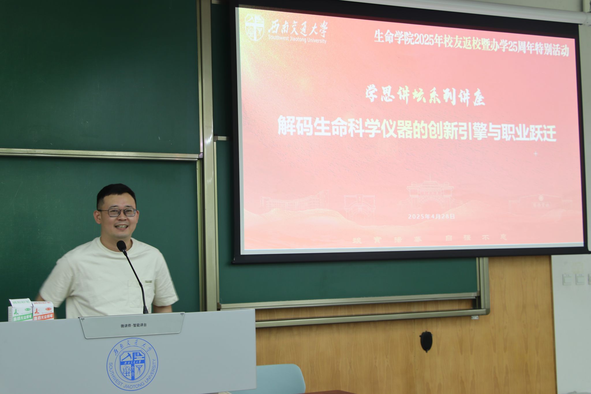 为凝聚校友情谊、共谋未来发展,根据学校2025年校友秩年返校活动安排和英国bat365官网登录入口办学25周年特别活动安排,4月28日下午,《解码生命科学仪器的创新引擎与职业跃迁》主题分享于犀浦校区X4158举行。成都雄毅科技有限公司董事长何健雄、总经理宋利平、副总经理贾文武、行政经理叶玉凤、英国bat365官网登录入口党委副书记高鹏、学院副院长王毅及100余名学生参加活动。