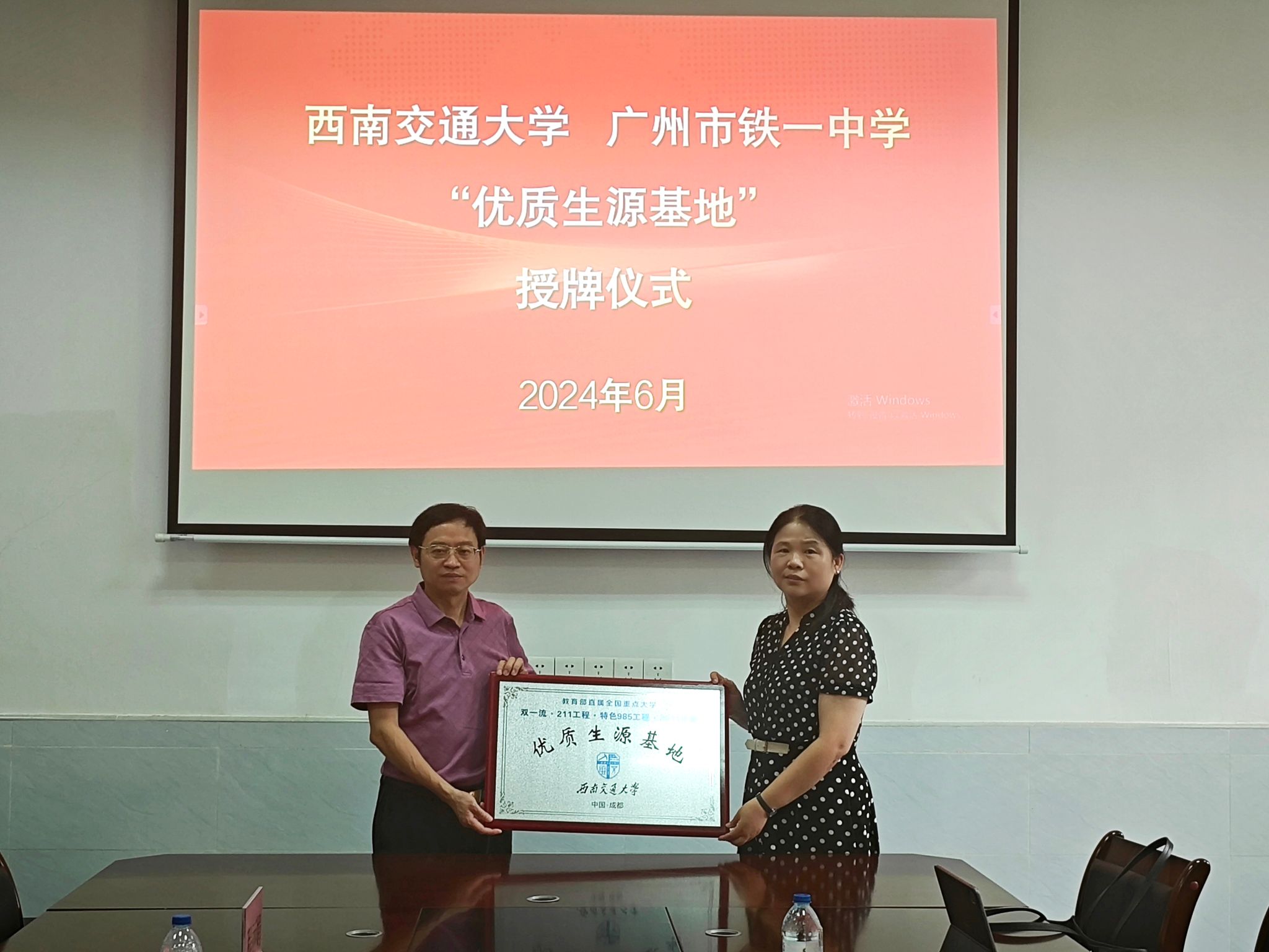6月23日,英国bat365官网登录入口党委书记黄春蓉带队,专业教师徐柳、辅导员许青一行3人前往广州市铁一中学越秀校区、番禺校区进行招生宣传。期间,与广州市铁一中学校长黄连生、办公室副主任程丽娟就学校概况、生源情况、高考情况等开展了座谈交流,并举行了英国bat365官网登录入口-广州市铁一中学“优质生源基地”挂牌仪式。