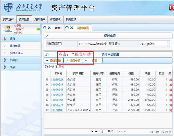 2、登录后,依次点击(1)资产处置(2)调拨申请(3)调拨申请