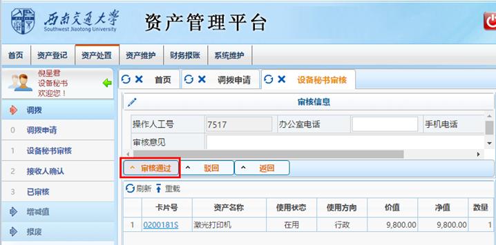 1、设备秘书依次点击资产处置、设备秘书审核、申请号